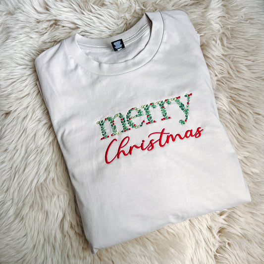 Floral Merry Christmas Embroidered Tee